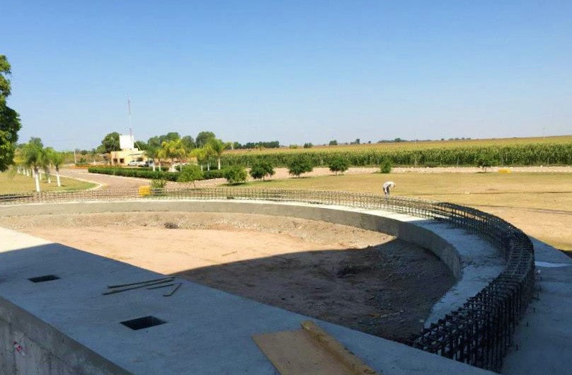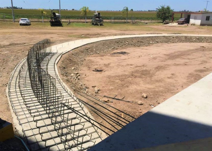 Construcción de terracerías con el análisis de un laboratorio de suelos para determinar la capacidad de carga del terreno, trazo y nivelación del mismo, excavación con maquinaria, cimbrado a base de madera prefabricada, construcción de refuerzos de acero y colado de concreto de 250 kg/cm2, relleno con maquinaria y limpieza.